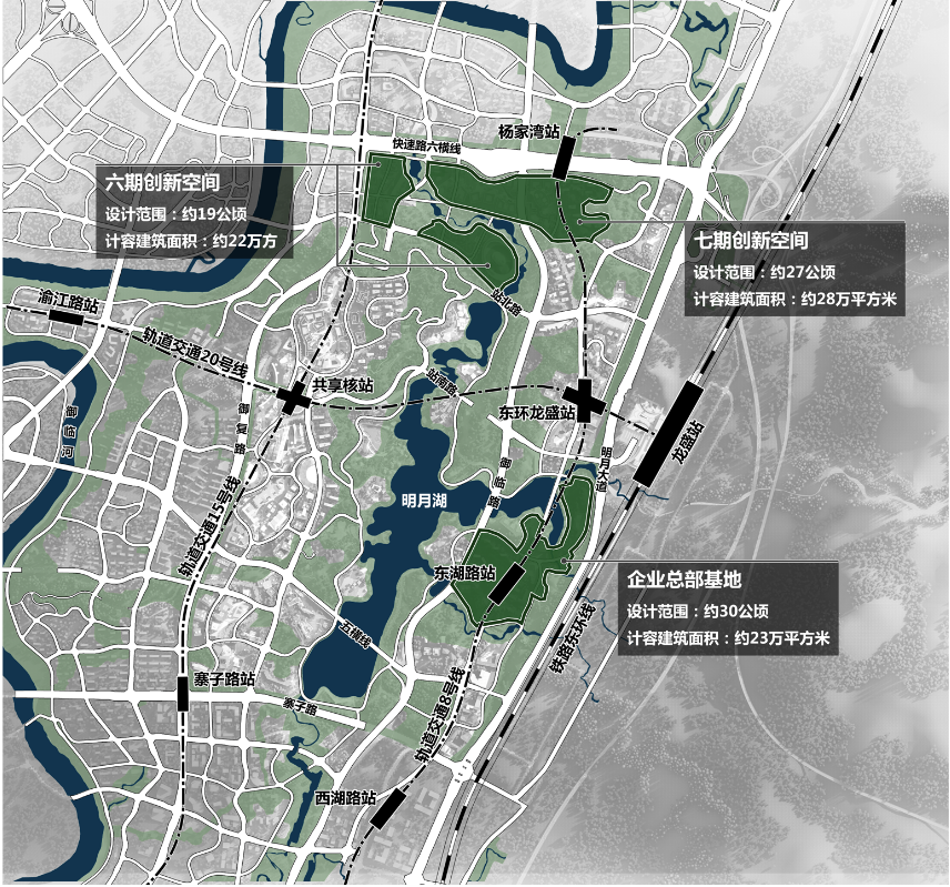七期創(chuàng)新空間設(shè)計范圍約27公頃,計容建筑面積約28萬方,以發(fā)展空間靈活的專業(yè)科研平臺為核心,旨在打造合作共贏的聯(lián)動辦公空間。該組團(tuán)以研發(fā)辦公為主體,配套商業(yè)、居住及公服設(shè)施,打造聯(lián)合創(chuàng)新中心。
