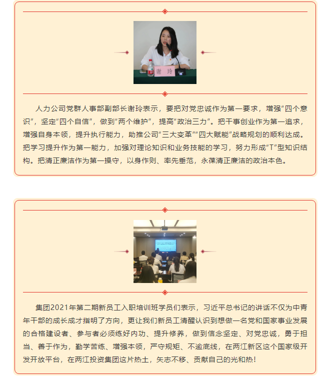 蔣興益認(rèn)真聽取了年輕干部代表們的發(fā)言,他邊聽邊記,不時與大家交流探討。他從“為什么學(xué)”“學(xué)什么”“怎么學(xué)”三個方面,為大家梳理了習(xí)近平總書記五次在中青年干部培訓(xùn)班開班式上重要講話的主題和內(nèi)容,從黨和國家事業(yè)發(fā)展的接班人、市屬重點國企的骨干力量、兩江新區(qū)開發(fā)開放的主力軍主窗口主戰(zhàn)場方面講清楚了學(xué)習(xí)的重大意義;從信念堅定、對黨忠誠,注重實際、實事求是,勇于擔(dān)當(dāng)、善于作為,堅持原則、敢于斗爭,嚴(yán)守規(guī)矩、不逾底線,勤學(xué)苦練、增強本領(lǐng)等方面,講清楚了學(xué)習(xí)的重點;從結(jié)合自身工作崗位實際、國有企業(yè)的干部標(biāo)準(zhǔn)、全面從嚴(yán)治黨骨干力量、構(gòu)建多樣化立體式分層級的培訓(xùn)體系等方面,講清楚了學(xué)習(xí)的方法論,鼓勵集團廣大干部職工練好內(nèi)功、提升修養(yǎng),努力成為可堪大用、能擔(dān)重任的棟梁之才。 蔣興益要求廣大干部職工,一要筑牢基石,做到信念堅定、對黨忠誠,深刻體悟二者的辯證關(guān)系,講真話、講實話、干實事、求實效,守好國企的“根”和“魂”。二要勤于學(xué)習(xí),自覺使學(xué)習(xí)成為一種迫切需要,提升時間管理能力,更新思維模式,著力解決好工作忙、看不懂的問題,學(xué)習(xí)一定要學(xué)到底。三要增強本領(lǐng),到最困難的地方磨煉自己,做難事立業(yè)、打爛仗立功,干事?lián)聯(lián)?zé),事不避難、義不逃責(zé),大膽地干、堅決地干。四要守住底線,清清白白做人、干干凈凈干事,嚴(yán)以修身、嚴(yán)于律己,珍惜現(xiàn)有的工作和生活,樹立正確的幸福觀,在新區(qū)打造“兩大”定位、建設(shè)“兩高兩區(qū)”目標(biāo)中當(dāng)尖兵、做表率、挑大梁、走前列。